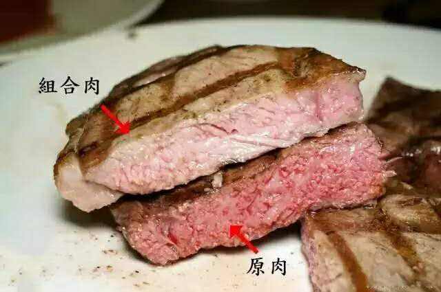 牛排按加工方式不同,可以分为原切牛排和重组牛排。原切牛排指的是未经任何预处理、直接切割包装的整块牛外脊、牛里脊,属于生鲜肉。重组牛排也可以叫拼接牛排,就是借助肉的重组技术,加工而成的调理肉制品。